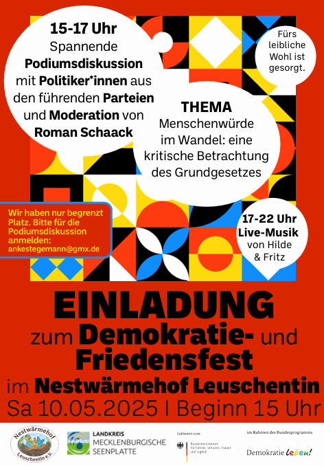 Das Demokratie- und Friedensfest auf dem Nestwärmehof Leuschentin möchte dem entgegentreten. Die Menschen der Region einladen miteinander ins Gespräch zu kommen, kritische Fragen zu stellen und einander tolerant zu begegnen.